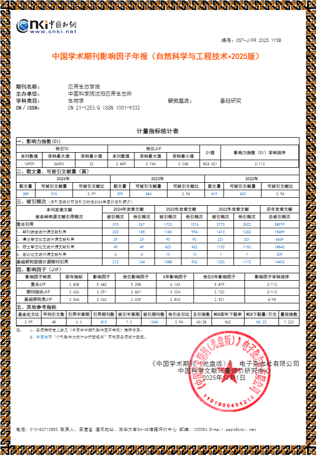 据中国知网《中国学术期刊影响因子年报(自然科学与工程技术﹒2025版)》,《应用生态学报》2024年影响因子5.682,总被引频次38979;影响力指数在112种生物学期刊中排名第2,在22种农业基础科学期刊中排名第1。共22篇论文入选2025年“领跑者F5000——中国精品科技期刊高被引论文”名单(中国科学技术信息研究所)。感谢为《应用生态学报》做出贡献的读者、作者、专家,感谢关注《应用生态学报》的朋友们!